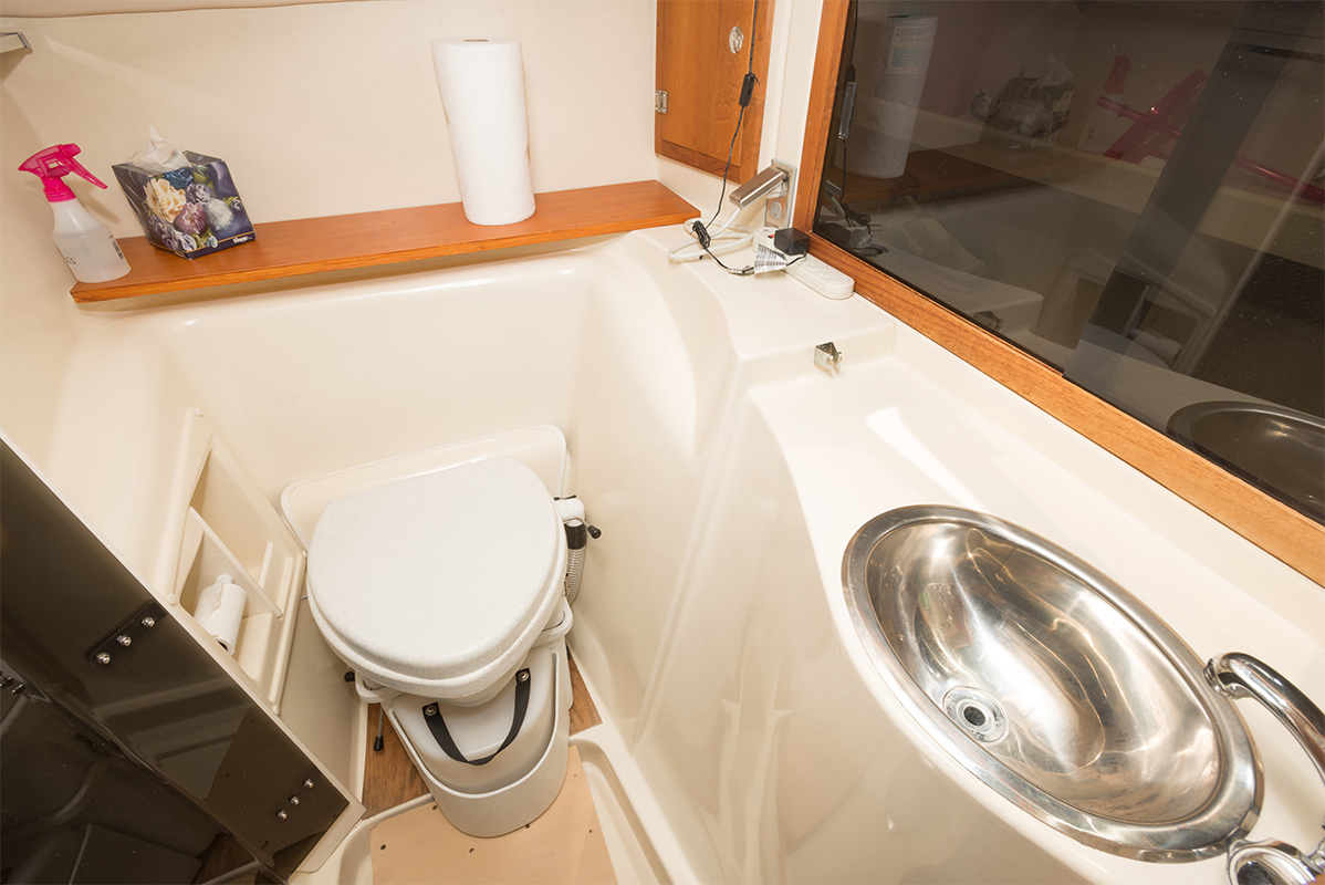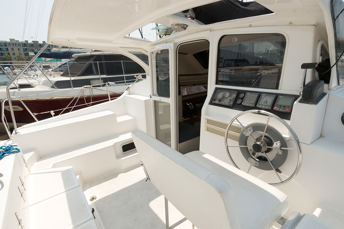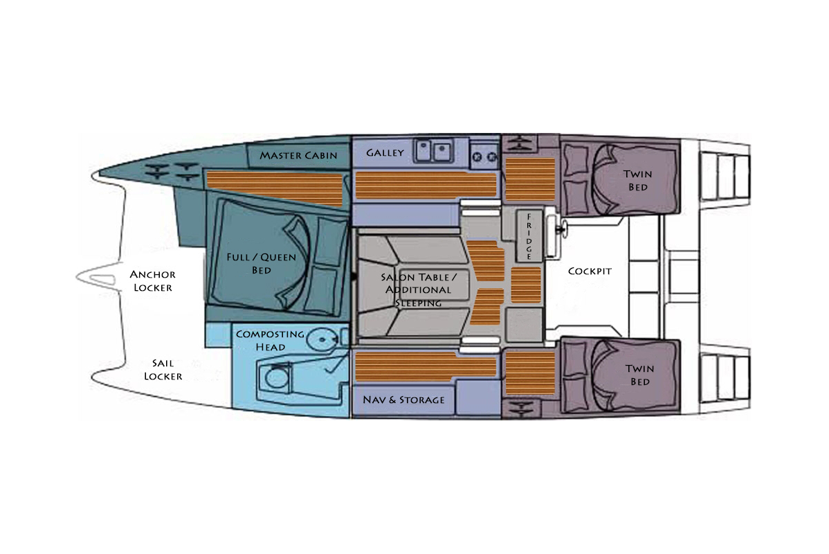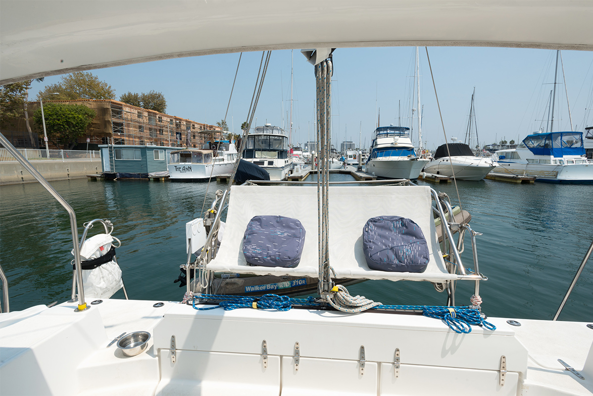 For over 27 years and over 1000 deliveries, the Gemini 105Mc still remains one of the most proven and popular catamarans ever built. Her sailing performance is legendary yet still manages to surprise unsuspecting newcomers. Serenity, built in late 2002, is a 34’ Gemini 105Mc catamaran sailboat with spacious, light, and airy accommodations … and her lifting centerboards / kick-up rudders will have you sailing through less than 2' of water.. While it's no surprise that Serenity is fast off the wind, her twin lifting centerboards, hull shape and sail plan combine to give her impressive upwind performance as well. Her deck layout and rig offers a stable and safe platform for your Southern California Coastal Adventure. The simple fact is, on most points of sail, a well designed catamaran is faster than a comparably sized monohull. And there is very little heel! A large cockpit with wheel steering and plenty of room for an afternoon picnic. Generous, hard foredeck is surrounded by a stainless pulpit for the entire bow and lifelines running along the somewhat narrow side decks. Her 14’ beam gives you spacious, light, and airy accommodations with 3 cabins and 1 head. Ogo Composting toilet is clean, quiet … and non-smelly! The salon table comfortably seats four to six sailors. The best seat in the house? There are several! A spacious and comfy stern hammock seats 2 or choose one of the 2 drop down seats on the bow.